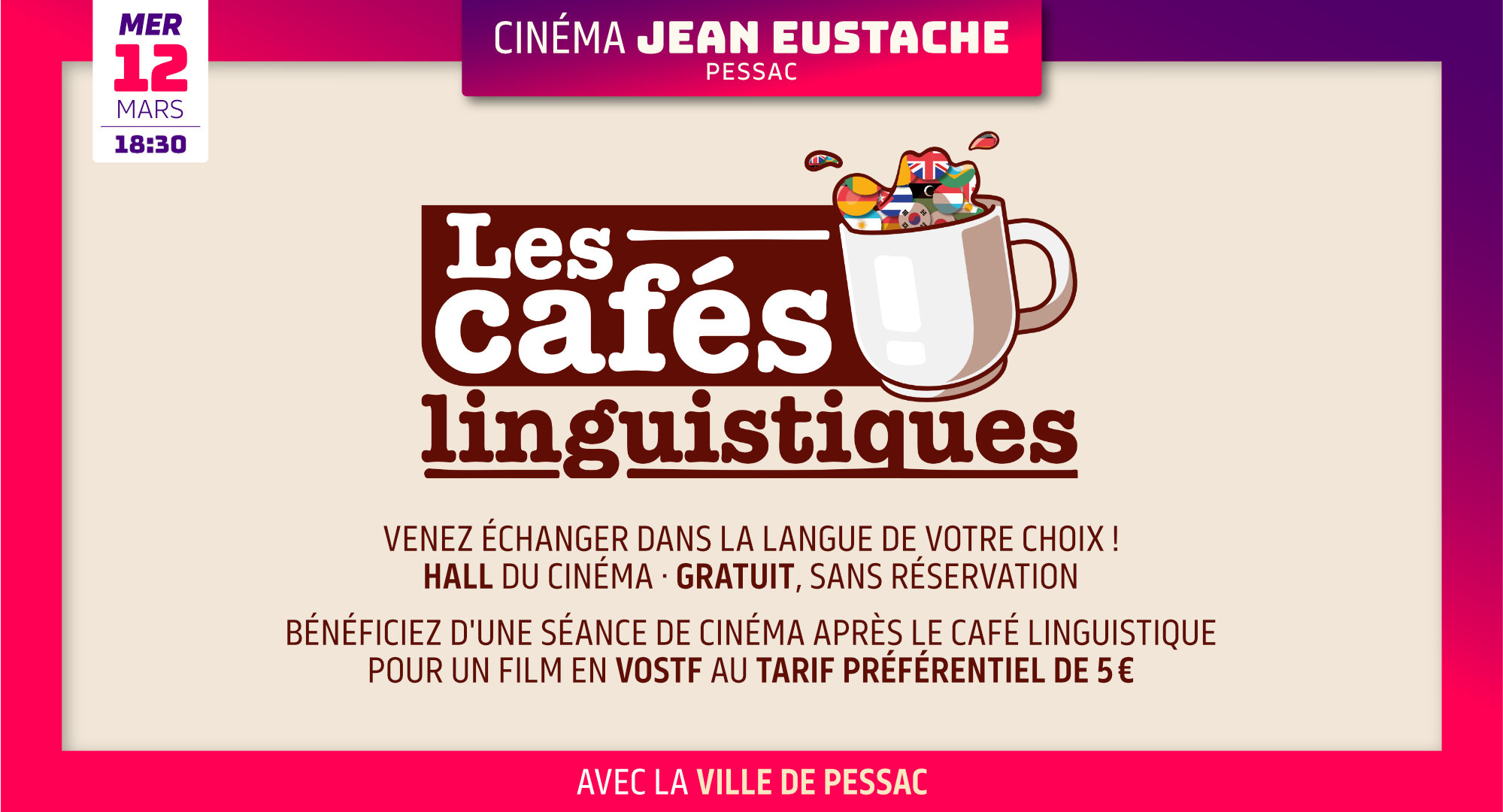 CAFÉ LINGUISTIQUE De 18h30 à 20h, dans le hall du cinéma – Gratuit, sans réservation. Dans le sillage du Café linguistique, tarif spécial pour les participants (5,50€) pour le film en langue étrangère (VOSTF) de leur choix. Une animation organisée par la Ville de Pessac.