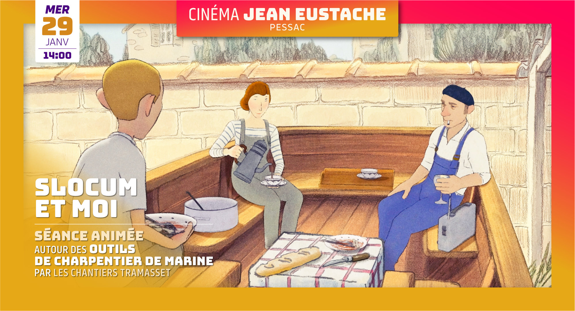 SLOCUM ET MOI - Film d'animation de Jean-François Laguionie Luxembourg, France · 2024 · 1h16 · Avec les voix d’Elias Hauter, Grégory Gadebois, Coraly Zahonero... Film suivi d'une animation en salle autour des outils du charpentier de marine par Les Chantiers Tramasset. Sans inscription. Tarifs habituels