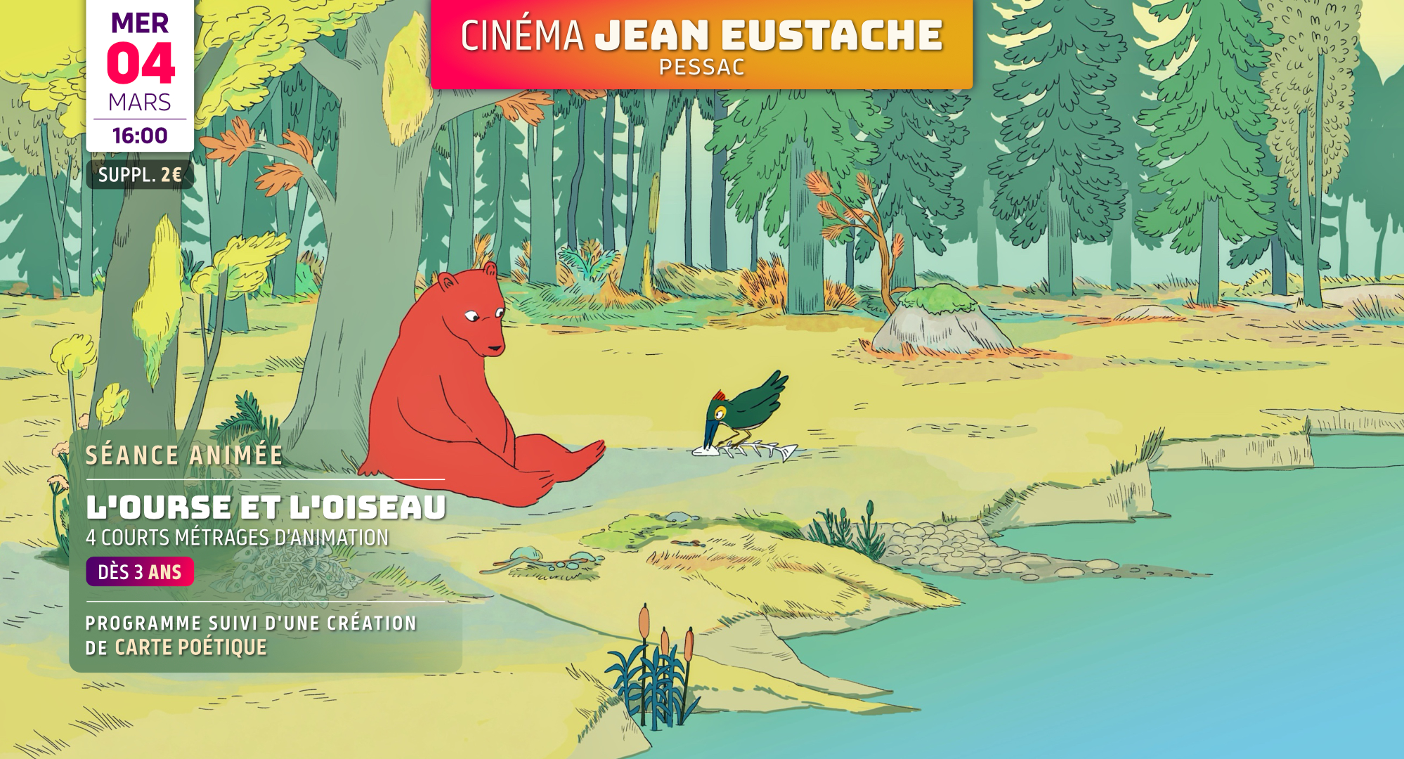 L'OURSE ET L'OISEAU - Programme de 4 courts métrages d'animation D'après l'album Les Lettres de l'ourse de David Gauthier et Marie Caudry. France, Russie · 2023 · 41min Film suivi d’une création de carte poétique. Sans inscription. Supplément de 2,00 €. |