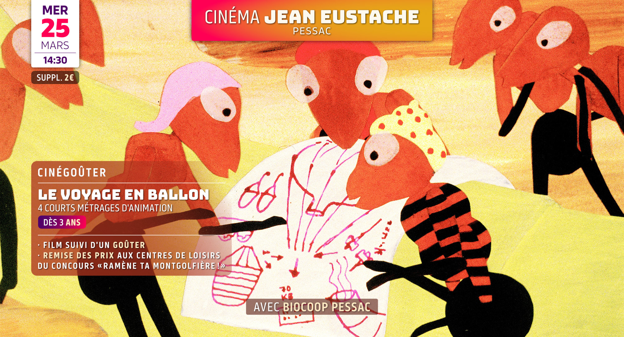 LE VOYAGE EN BALLON - Programme de 4 courts métrages d'animation France, Russie, Suède · 2004-2015 · 36 min Film suivi d'un goûter avec Biocoop Pessac. Remise des prix aux centres de loisirs pour le concours Toiles Filantes « Ramène ta montgolfière ! » Tarif unique : 6€, avec un supplément de 2€. |