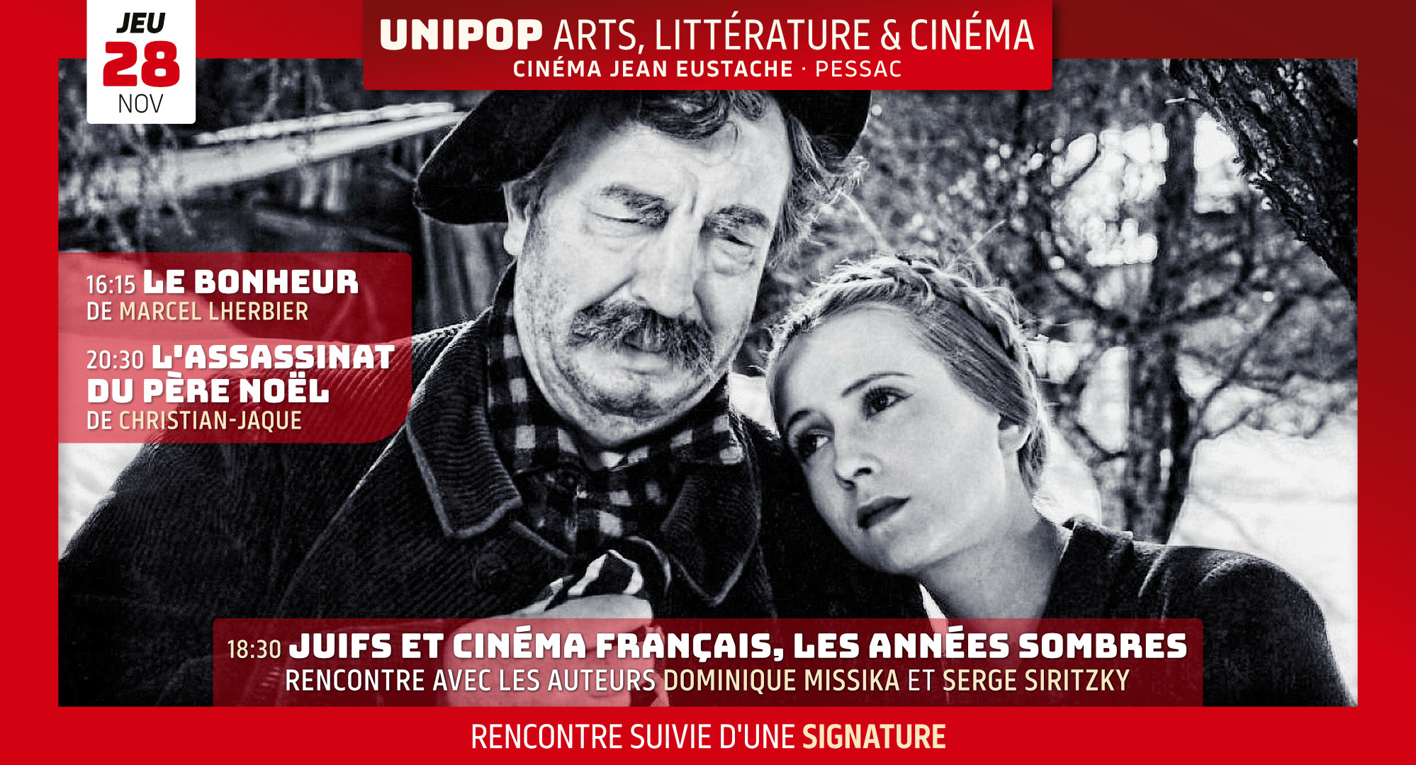 16h15 LE 1er FILM : LE BONHEUR de Marcel L'Herbier (1935, 1h40) 18h30 LA RENCONTRE : Juifs et cinémas français, les années sombres - Rencontre avec Dominique Missika et Serge Siritzky 20h30 LE 2e FILM : L'ASSASSINAT DU PÈRE NOËL de Christian-Jaque (1941, 1h45) Tarif des films : 6.50€ pour les inscrits (et Pass Unipop […]