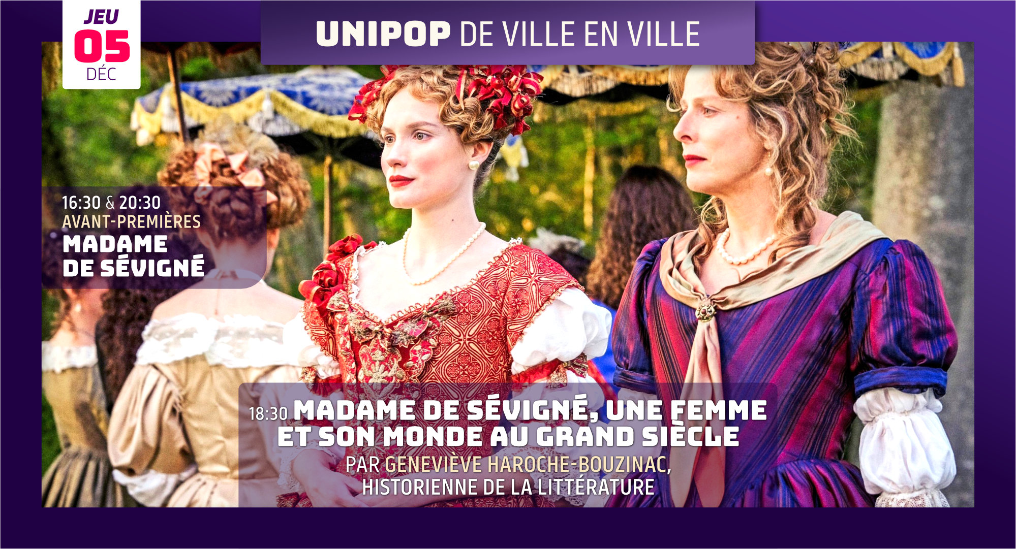 16h30 LE FILM : MADAME DE SÉVIGNÉ d'Isabelle Brocard (1h33)18h30 LA CONFÉRENCE : Madame de Sévigné, une femme et son monde au Grand Siècle, par Geneviève Haroche-Bouzinac20h30 LE FILM : MADAME DE SÉVIGNÉ d'Isabelle Brocard (1h33)Tarif du film : 6.50€ pour les inscrits, sinon tarifs habituels.