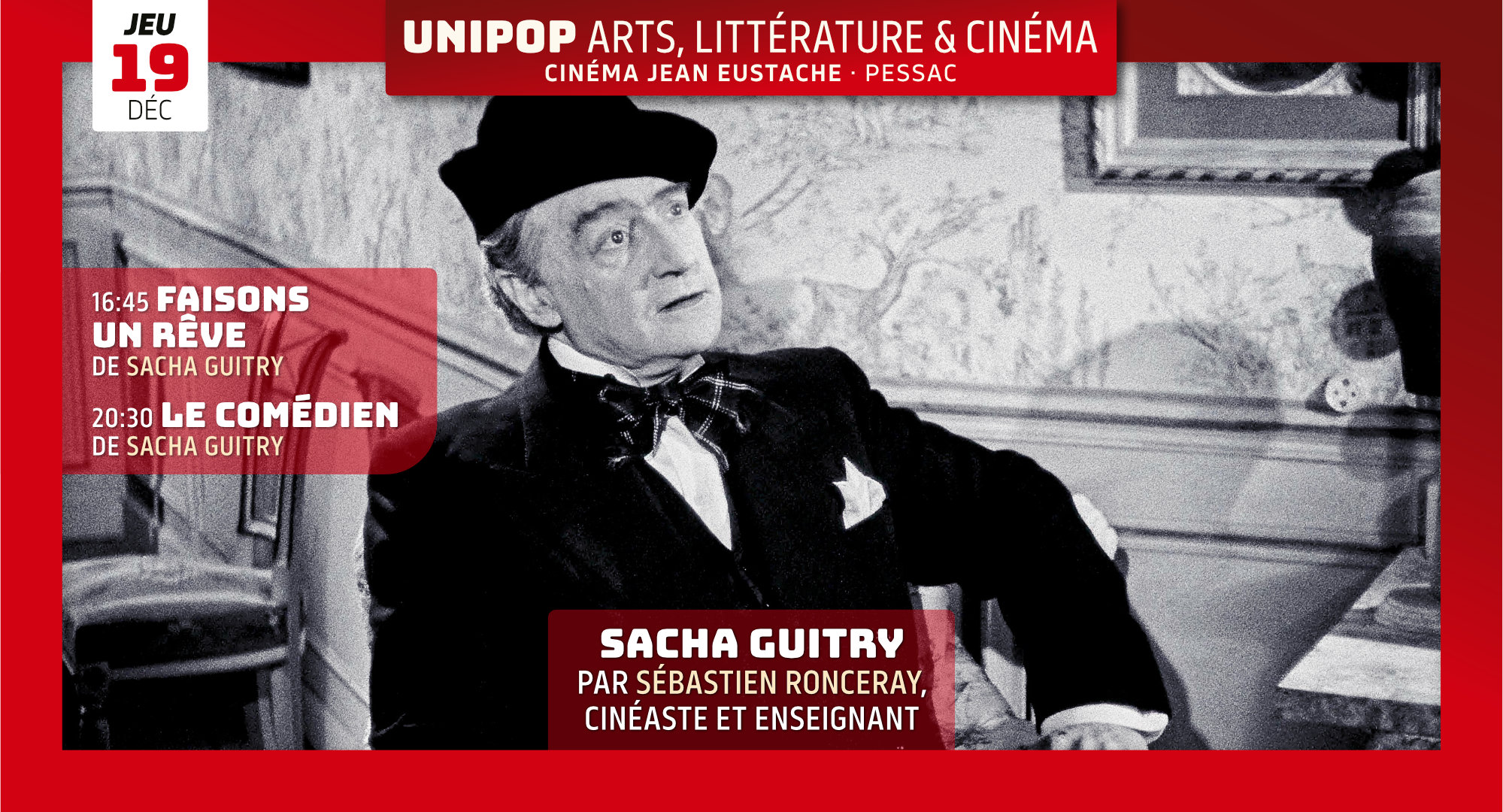 16h45 LE 1er FILM : FAISONS UN RÊVE de Sacha Guitry (1936, 1h20)18h30 LA CONFÉRENCE : Sacha Guitry, par Sébastien Ronceray20h30 LE 2e FILM : LE COMÉDIEN de Sacha Guitry (1948, 1h35)Tarif des films : 6.50€ pour les inscrits (et Pass Unipop à 10€ pour 2 séances), sinon tarifs habituels.