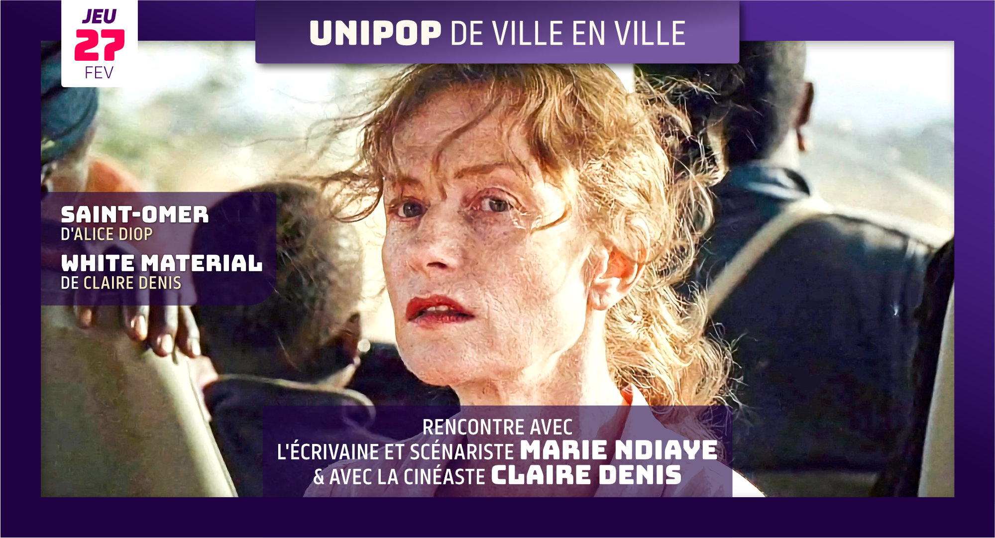16h30 LE 1er FILM : SAINT-OMER d'Alice Diop (2022, 2h02)18h30 LA RENCONTRE avec Marie NDiaye, écrivaine, et Claire Denis, réalisatrice20h30 LE 2ème FILM : WHITE MATERIAL de Claire Denis (2010, 1h42)Tarif des films : 6.50€ pour les inscrits (et Pass Unipop à 10€ pour 2 films), sinon tarifs habituels.