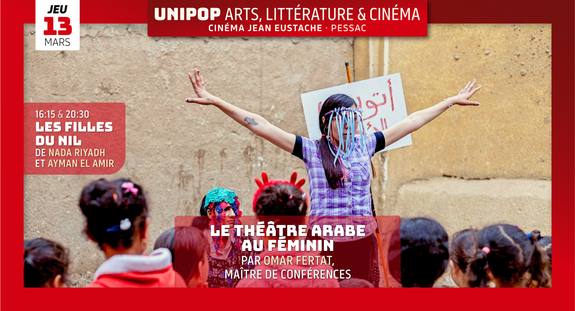 16h15 LE FILM : LES FILLES DU NIL de N. Riyadf et A. El Amir (2025, 1h42)18h30 LA CONFÉRENCE : Le théâtre arabe au féminin, par Omar Fertat20h30 LE FILM : LES FILLES DU NIL de N. Riyadf et A. El Amir (2025, 1h42)Tarif du film : 6.50€ pour les inscrits, sinon tarifs habituels.