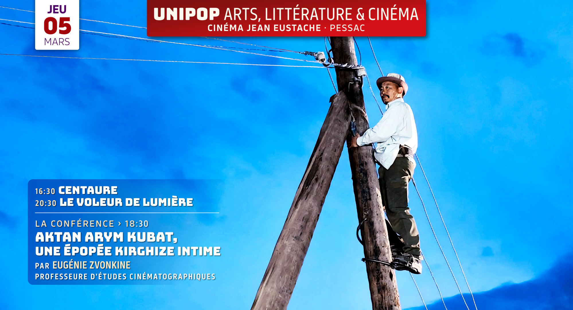 16h30 : CENTAURE d'Aktan Arym Kubat (1h30, VOSFR) 18h30 : LA CONFÉRENCE : Aktan Arym Kubat, une épopée kirghize intime par Eugénie Zvonkine20h30 : LE VOLEUR DE LUMIÈRE d'Aktan Arym Kubat (1h16, VOSFR)Le lendemain, vendredi 06 mars à 16h30 : LE VOLEUR DE LUMIÈRE d'Aktan Arym Kubat (1h16, VOSFR)Tarif des films : 6.50€ pour les inscrits (et […] |