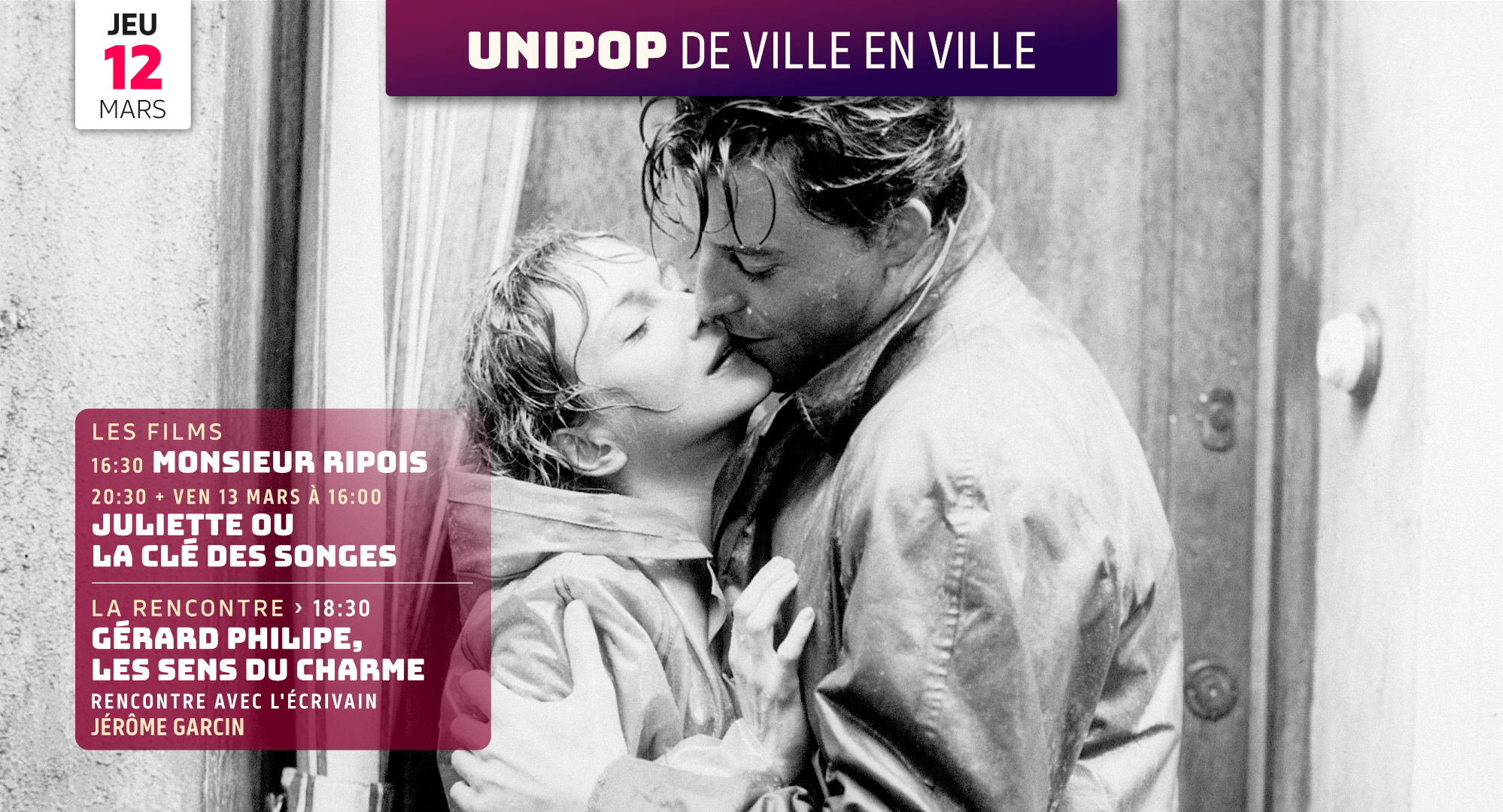 16h30 : MONSIEUR RIPOIS de René Clément (1h40)18h30 : LA CONFÉRENCE : Gérard Philipe, les sens du charme, rencontre avec l’écrivain Jérôme Garcin et la comédienne Anne-Marie Philipe, animée par Jean-Claude Raspiengeas20h30 : JULIETTE OU LA CLÉ DES SONGES de Marcel Carné (1h33) Le lendemain, vendredi 13 mars à 16h15 : JULIETTE OU LA CLÉ DES SONGES […] |