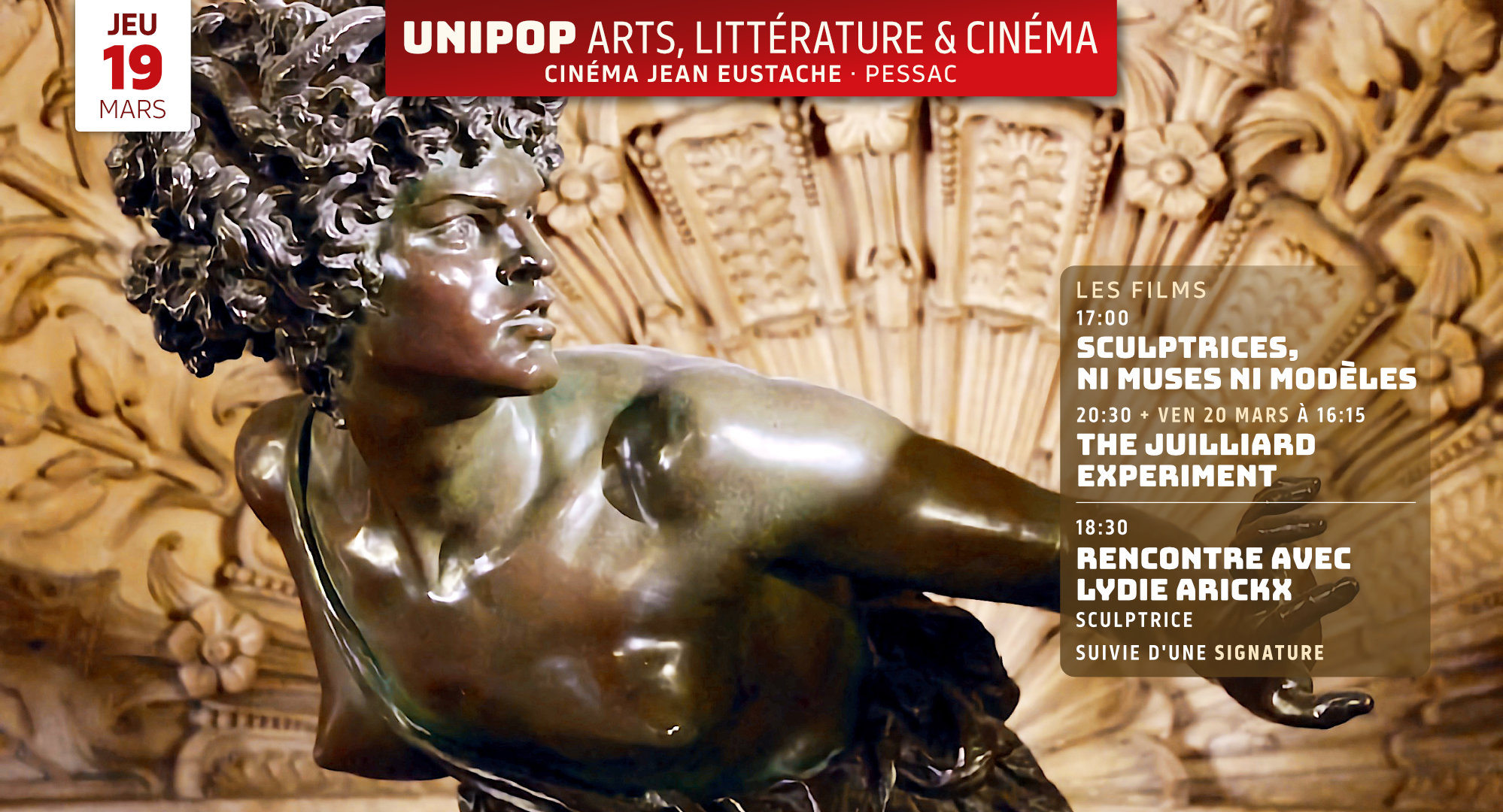 17h00 : SCULPTRICES, NI MUSES NI MODÈLES de Émilie Valentin (52 min) 18h30 : Rencontre avec la sculptrice Lydie Arickx20h30 : THE JUILLIARD EXPERIMENT de Mark Kidel (1h30) Le lendemain, vendredi 20 mars à 16h15 : THE JUILLIARD EXPERIMENT de Mark Kidel (1h30) En partenariat avec l'Artothèque de Pessac. Tarif des films : 6.50€ pour les inscrits […] |