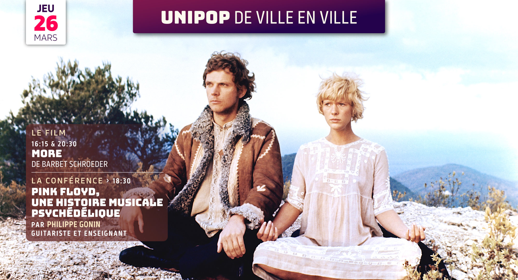 16h15 : MORE de Barbet Schroeder (1h54, VOSFR) 18h30 : LA CONFÉRENCE : Pink Floyd, une histoire musicale psychédélique par Philippe Gonin20h30 : MORE de Barbet Schroeder (1h54, VOSFR)Tarif du film : 6.50€ pour les inscrits, sinon tarifs habituels. |