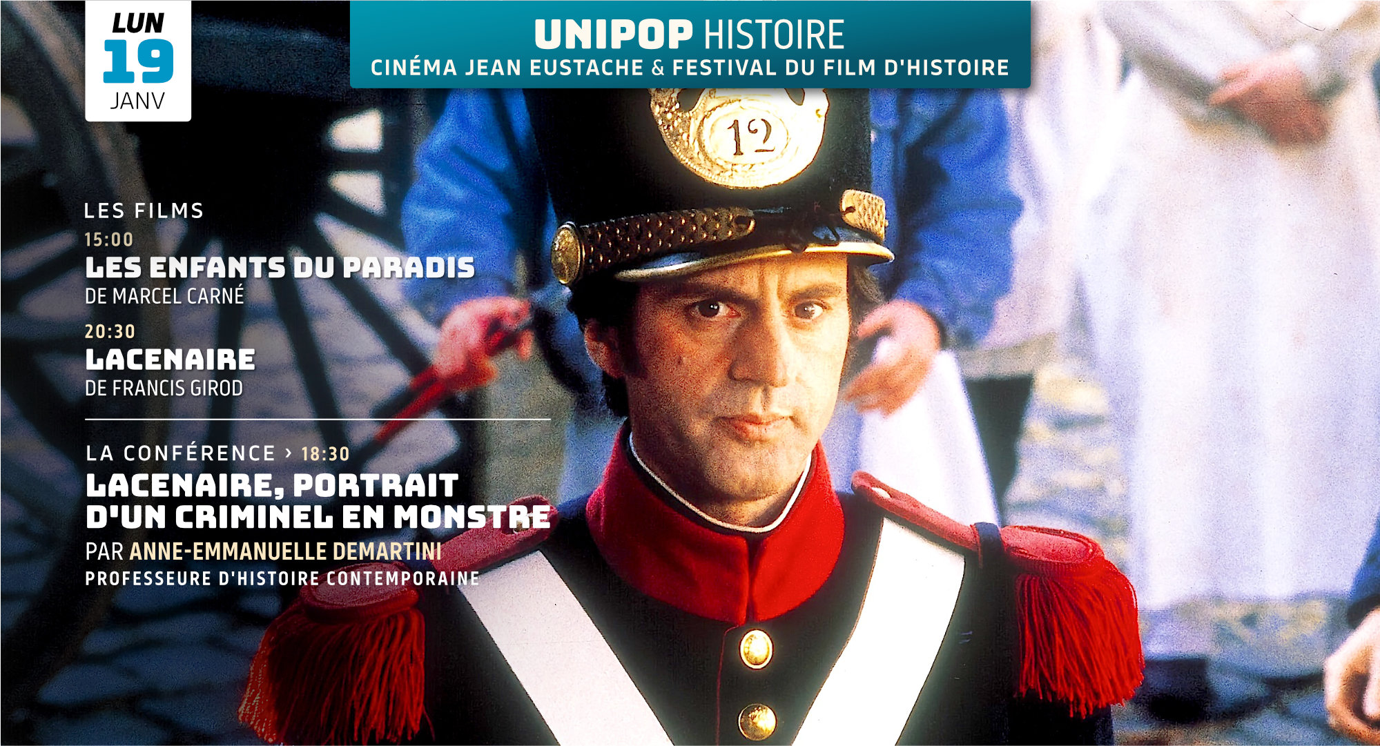 15h00 : LES ENFANTS DU PARADIS de Marcel Carné (3h09)18h30 : LA CONFÉRENCE : Lacenaire. Portrait d’un criminel en monstre par Anne-Emmanuelle Demartini20h30 : LACENAIRE de Francis Girod (2h05)Tarif des films : 6.50€ pour les inscrits (et Pass Unipop à 10€ pour 2 films), sinon tarifs habituels. |