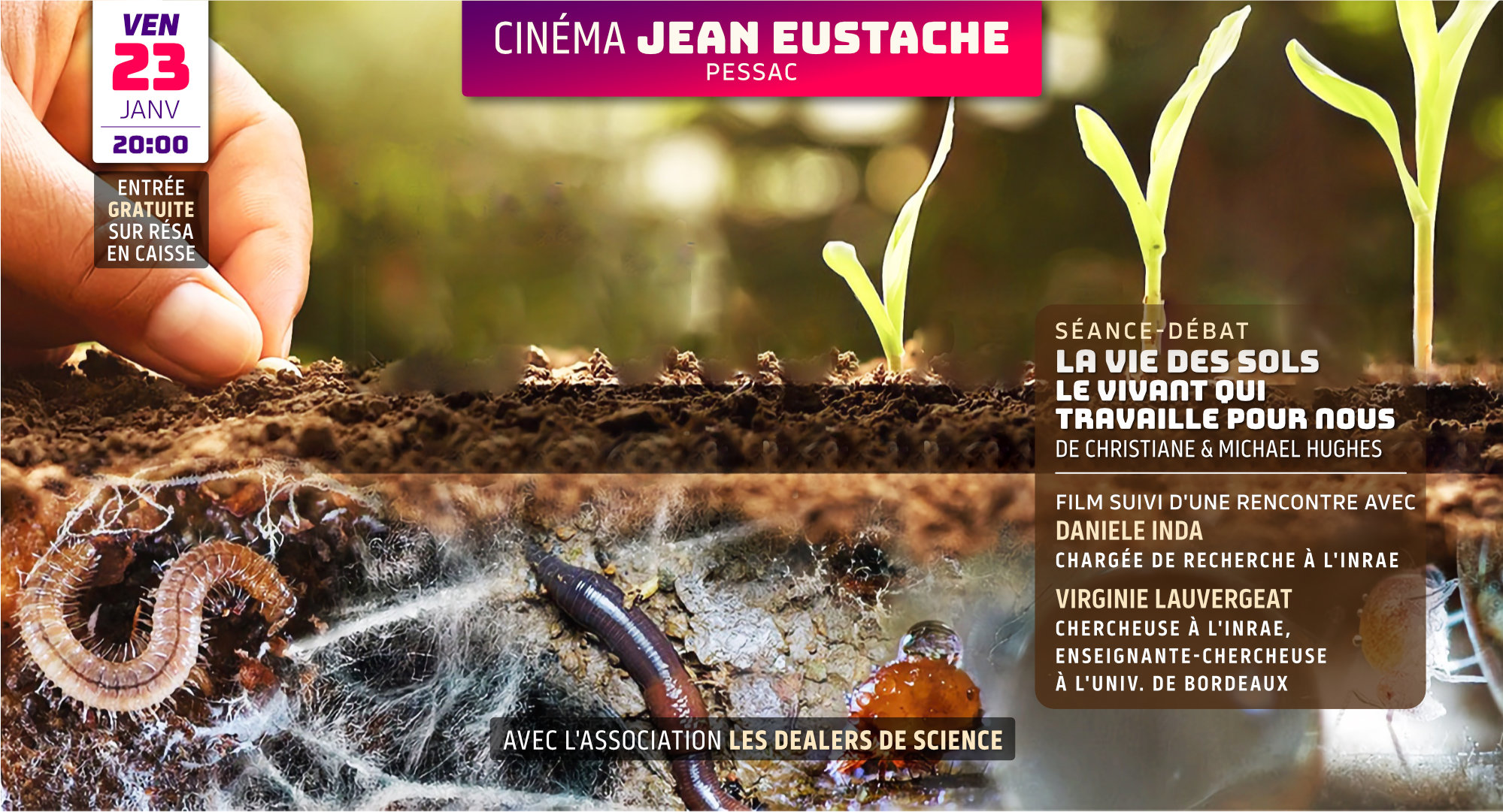 Séance organisée par l'association étudiante Les Dealers de Science. Film suivi d'un échange animé par un étudiant.e du master « Médiation et communication des sciences et des techniques » de l’Université Bordeaux Montaigne, en présence de Daniele Inda, Chargé de recherche Inrae en sociologie des mondes agricoles, et Virginie Lauvergeat, enseignante-chercheuse à l’Université de Bordeaux […]