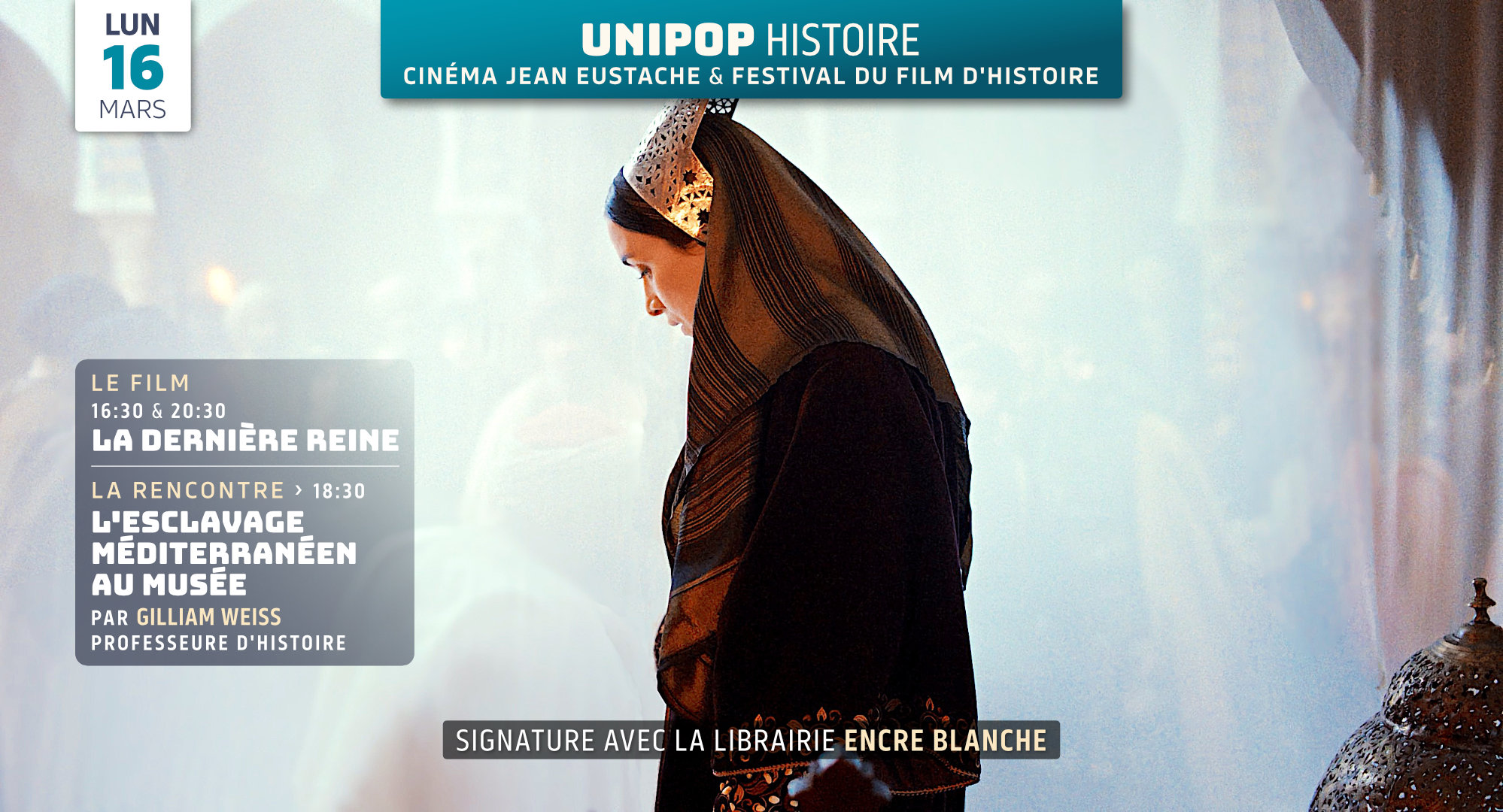 16h15 : LA DERNIÈRE REINE de Adila Bendimerad et Damien Ounouri (1h50, VOSTFR)18h30 : LA CONFÉRENCE : L'esclavage méditerranéen au musée par Gillian Weiss20h30 : LA DERNIÈRE REINE de Adila Bendimerad et Damien Ounouri (1h50, VOSTFR)Tarif du film : 6.50€ pour les inscrits, sinon tarifs habituels. |