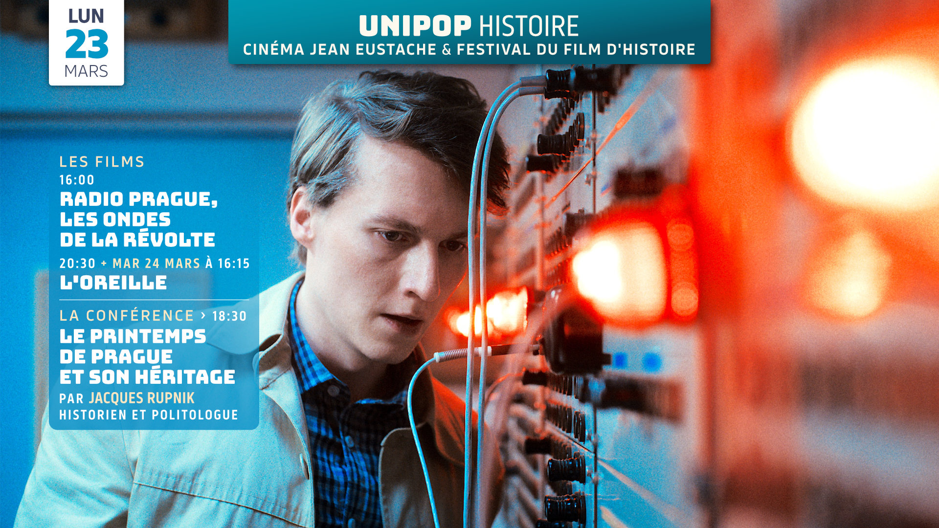 16h00 : RADIO PRAGUE, LES ONDES DE LA RÉVOLTE de Jiří Mádl (1h55, VOSTFR)18h30 : LA CONFÉRENCE : Le printemps de Prague et son héritage par Jacques Rupnik20h30 : L'OREILLE (UCHO) de Karel Kachyňa (1h36, VOSTFR)Le lendemain, mardi 24 mars à 16h15 : L'OREILLE (UCHO) de Karel Kachyňa (1h36, VOSTFR)Tarif des films : 6.50€ pour les inscrits […] |