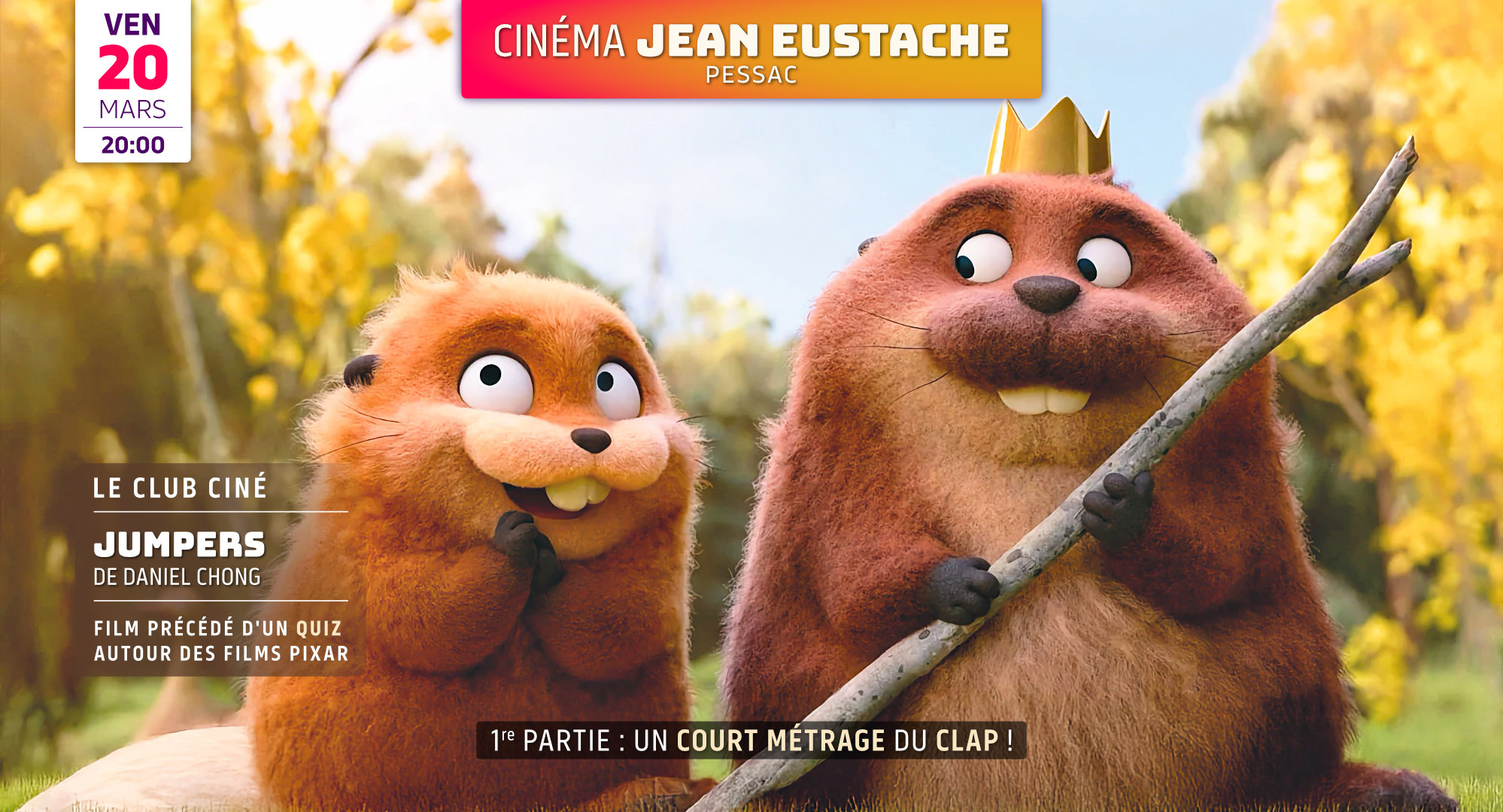 JUMPERS - Film d'animation de Daniel Chong États-Unis · 2026 · 1h44 Ciné-Relax : des séances ouvertes à tous, adaptées et bienveillantes pour les personnes dont le handicap peut entraîner des troubles du comportements. Un dispositif à l’initiative de la ville de Pessac en partenariat avec l'association Autisme Interphase. Tarifs : 5,50€/6,50€. |