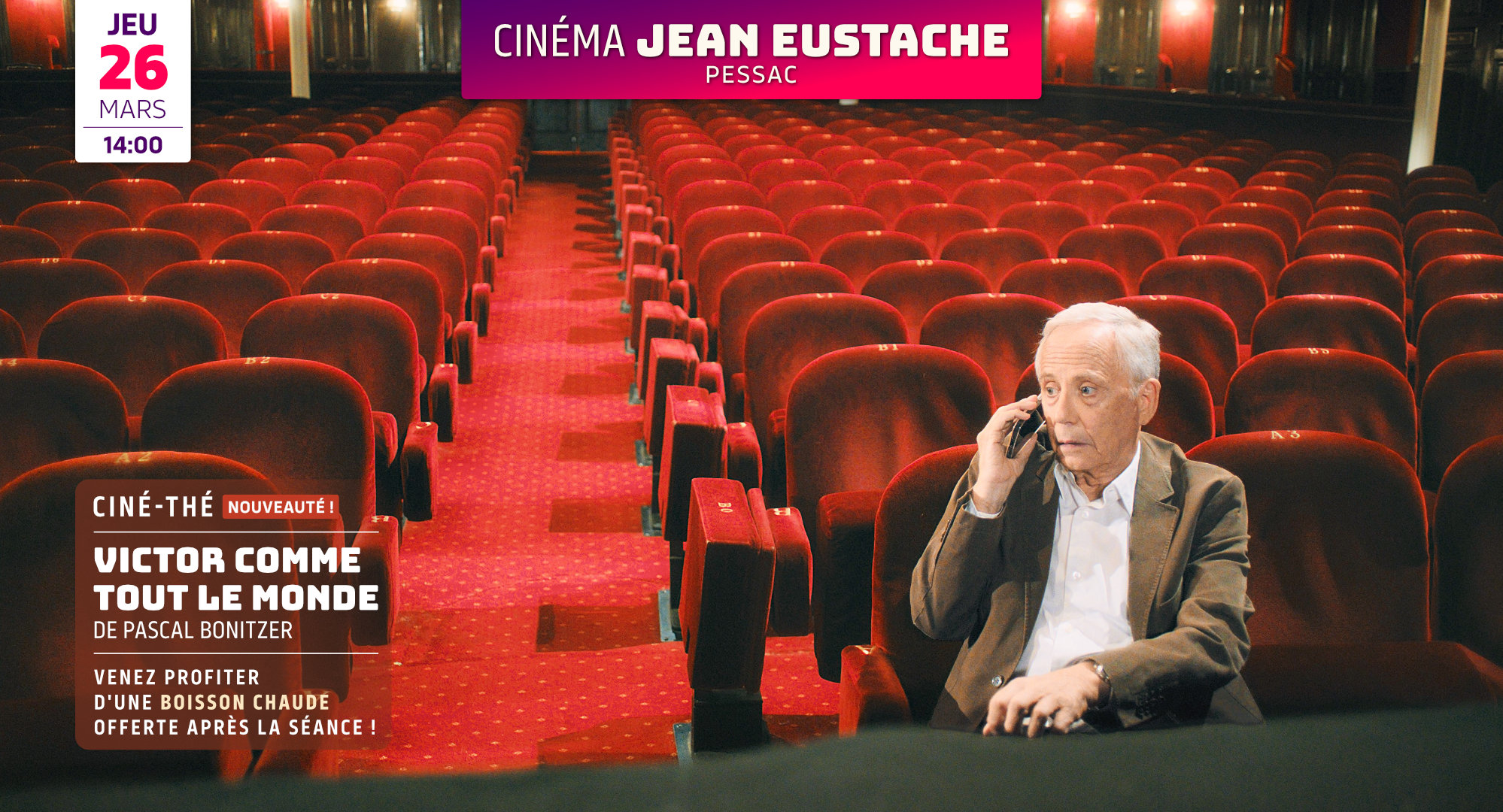 VICTOR COMME TOUT LE MONDE de Pascal Bonitzer - France - 2026 - 1h28 Un nouveau rendez-vous convivial au Jean Eustache : venez profiter d'une boisson chaude offerte dans le hall du cinéma après la séance. Habité par Victor Hugo, le comédien Robert Zucchini traîne une douce mélancolie lorsqu'il n'est pas sur scène. Chaque soir, […]